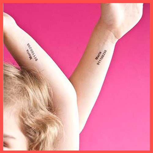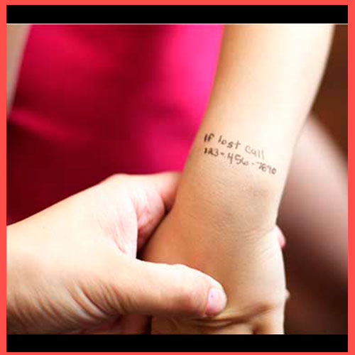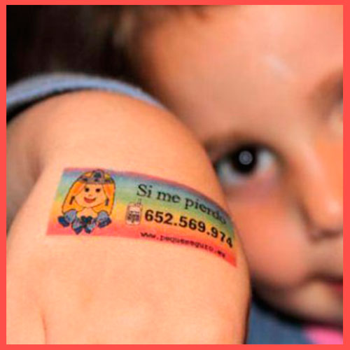 Podemos crear calcomanías y tattoos temporales para identificar a los niños cuando salimos de viaje o para excursiones de la guardería y el colegio, por si el niño se extravía. En la calcomanía indicamos los datos necesarios como el nombre y el número de teléfono del colegio, para llamar en caso de que se pierda, pero se puede personalizar con más datos, imágenes, logos, textos y números. Por ejemplo se pueden indicar datos de niños y adultos con necesidades especiales como: alergias, autismo, alzheimer y discapacidades.